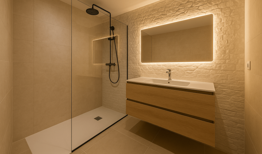 - Revestimientos porcelánicos grandes (120×120 cm) para reducir juntas y lograr estética tipo spa.